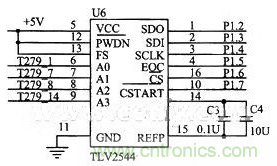 來lai自zi傳chuan感gan器qi的de模mo擬ni信xin號hao,在zai送song入ru模mo擬ni數shu字zi轉zhuan換huan電dian路lu之zhi前qian,由you於yu器qi件jian的de輸shu入ru阻zu抗kang比bi較jiao低di,而er傳chuan感gan器qi的de輸shu出chu阻zu抗kang較jiao高gao,不bu能neng直zhi接jie把ba模mo擬ni信xin號hao送song入ru模mo擬ni數shu字zi轉zhuan換huan電dian路lu。本ben文wen采cai用yongTLC279構成電壓跟隨器,實現阻抗變換。考慮到在FPGA實現的算法處理對數據的精度敏感,因此,係統選用了四路模擬量輸入的12 bit串行數據輸出的TLV2544作為模擬數字轉換電路的核心芯片。