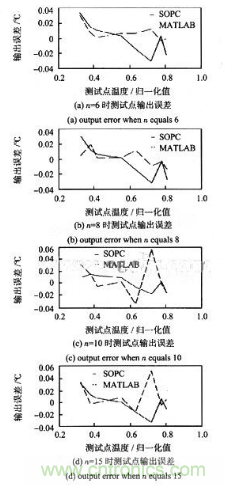 圖4是58對訓練樣本完成網絡訓練後的測試結果。由於BP神經網絡的性能受隱含層節點個數影響比較大,圖中數據是在不同隱含層節點個數的條件下得到的,並與MATLAB軟件仿真得到的結果作了比較。網絡訓練的條件:學習率為0.1,動量係數為0.9,增益為1,SOPC停止迭代的判斷條件是輸出絕對誤差累加和小於0.01,MATLAB停止迭代的判斷條件是均方根誤差小於0.0001,圖中,n代表隱含層節點個數。
