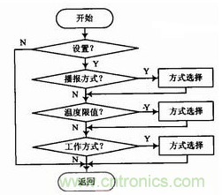 可設置的參數主要有,播報方式:“連續、隔x秒、禁止”;報警溫度值;工作方式等。在需要實時關注溫度值的時候,可以設置為連續播報;溫度變化較慢的時候可以設置為隔x秒方式;夜ye晚wan設she置zhi報bao警jing模mo式shi後hou,可ke以yi設she置zhi為wei禁jin止zhi播bo報bao模mo式shi。設she置zhi報bao警jing溫wen度du值zhi後hou可ke以yi,可ke以yi處chu理li其qi他ta事shi情qing,在zai出chu現xian警jing情qing時shi,係xi統tong給gei出chu報bao警jing,提ti示shi用yong戶hu。選xuan擇ze工gong作zuo方fang式shi為wei“聯網工作”後(hou),係(xi)統(tong)除(chu)了(le)現(xian)場(chang)播(bo)報(bao)和(he)報(bao)警(jing)外(wai),還(hai)將(jiang)相(xiang)應(ying)信(xin)息(xi)通(tong)過(guo)異(yi)步(bu)串(chuan)行(xing)口(kou)發(fa)送(song)到(dao)遠(yuan)端(duan)。設(she)置(zhi)過(guo)程(cheng)全(quan)部(bu)采(cai)用(yong)語(yu)音(yin)菜(cai)單(dan)方(fang)式(shi),可(ke)以(yi)大(da)幅(fu)度(du)較(jiao)低(di)成(cheng)本(ben),設(she)置(zhi)流(liu)程(cheng)圖(tu)如(ru)圖(tu)2所示。