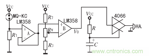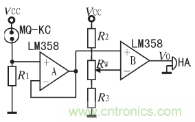 圖l中,R1是傳感器要求的負載電阻,阻值為120 Ω,Vcc為9 V電源電壓;A、B為LM358雙運放,A為跟隨器,起緩衝隔離作用,以便將R1上的電壓VR1基本上全部施加到比較器B的同相輸入端。RW為報警靈敏度調整電位器。穩態時,調整RW使得加到比較器反相輸入端的電壓V-略高於穩態時R1上的電壓VR1這個電壓越高,報警靈敏度就越低。加電並使傳感器達到穩態後,MQ-KC為較穩定的固定阻值,當Vcc不變時,VR1基本為一固定值,保持不變。當有可燃性氣體泄露時,傳感器接觸到可燃氣,使其電導率上升,電阻下降,使VR1上升,當VR1高於V-時,比較器輸出一個大於7 V的電壓,從而使蜂鳴器HA發出滴、滴的報警聲。若用該電壓控製一個繼電器,即可實現控製功能。為了提高抗幹擾能力,可分別在R1和B的V-端並聯一隻濾波電容。