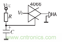 圖1所示的基本報警電路的不足:一開始加電時,傳感器尚未達到穩態,其電阻值較小,VR1較大,導致蜂鳴器HA誤報警。為了解決這一問題,采用一個數字信號控製的模擬開關,其控製信號采用簡單的電容充電延時電路,原理圖如圖2所示。圖1中比較器B的輸出V0加到模擬開關4066的輸入端,開關的輸出端接蜂鳴器HA。初始加電時,電容C上的電壓VC為0,4066不導通,無論V0值為多高,HA都不會報警。隨著電容充電,VC不斷升高,當達到4066的控製門限閾值時,4066才導通,即能進入報警狀態。電容充電使其電壓達到4066的控製門限閾值時間即為延時時間。電容C和電阻R的取值可根據延時要求確定。為可靠起見,取RC=1/2T,T為傳感器初始穩定時間。本裝置取R=l MΩ,C=100μF,即能實現可靠的延時。