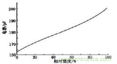 目前, 生產濕敏電容的主要廠家是法國Humirel 公司。它生產的HS1101 測量範圍是0%~100%RH,電容量由162PF 變到200PF,其誤差不大於±2%RH;響應時間小於5S;濕度係數為0.34PF/℃;年漂移量0.5%RH/年,長期穩定。圖1 為HS1101 濕敏電容的濕度-電容響應曲線。