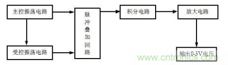 HS1101在(zai)電(dian)路(lu)中(zhong)相(xiang)當(dang)於(yu)一(yi)個(ge)電(dian)容(rong)器(qi)件(jian),它(ta)的(de)電(dian)容(rong)量(liang)隨(sui)著(zhe)所(suo)測(ce)空(kong)氣(qi)濕(shi)度(du)的(de)增(zeng)加(jia)而(er)增(zeng)大(da),為(wei)了(le)能(neng)將(jiang)電(dian)容(rong)的(de)變(bian)化(hua)轉(zhuan)換(huan)成(cheng)電(dian)壓(ya)的(de)變(bian)化(hua),我(wo)們(men)設(she)計(ji)了(le)振(zhen)蕩(dang)電(dian)路(lu)、消除零點電容影響電路、整流電路、積分電路、電壓—電流轉換電路、放大電路等,其工作原理簡圖如圖2 所示。