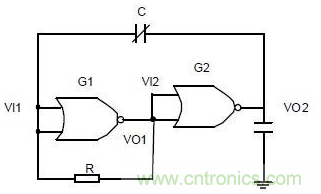 振蕩電路的作用是將電容的變化量轉化為頻率可變的方波。由圖3 可知,這是一個非對稱多諧振蕩器。或非門G1 工作在電壓傳輸特性的轉折區,把它的輸出電壓直接連接到或非門G2 的輸入端。G2即可得到一個介於高低電平之間的靜態偏置電壓,從而使G2 的靜態工作點也處於電壓傳輸特性轉折區上。反饋環路中電容使電路在兩個暫穩態之間往複振蕩。