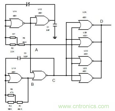 隻要調整C 的脈衝寬度,就可以得到D 的脈衝寬度,從而可以消除零點電容,經過調製的電容變化信號也就是濕度信號。將同一封裝內的門電路U2A、U2B、U2C、U2D 並聯使用,可以擴大CMOS 門電路輸出低電平時吸收負載電流的能力。