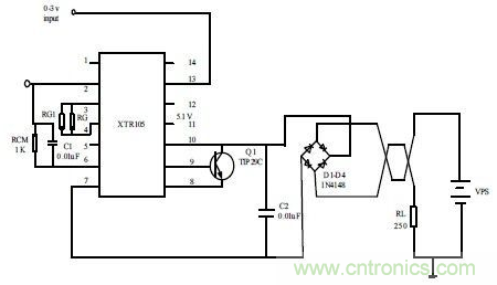 輸出的0~3V 電壓通過XTR105 芯片的2 和13 引腳輸入。調整3 和4 引腳間的電阻RG和RG1 的值,可以改變XTR105 芯片的內置儀表放大器增益值,從而選定合適的測量範圍。RCM 取為1KO,它提供一個附加電壓降,使XTR105 的輸入電壓限製在共模方式下的電壓範圍內。與RCM 並聯的0.01μF 旁路電容用於降低共模噪聲。