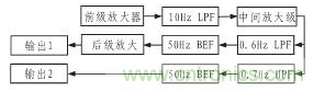 放大濾波電路是根據人體的呼吸率範圍(15~20次/min)和心率範圍(50~100次/min),經相關檢測電路的信號分為兩路,分別檢測呼吸和心跳 信號,具體結構框圖如圖4所示。其中放大電路主要包括前置放大電路、中間級放大電路和後級放大電路3部分。濾波電路主要有低通濾波、高通濾波和帶阻濾波。 其分別組成0.6 Hz的低通濾波器(CPF)、0.7 Hz的高通濾波器(HPE)及50 Hz的陷波器(BEF)。
