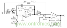 該低通濾波電路主要濾除幹擾信號,並且要求幅頻特性中有最大的平坦區,為此選用四階壓控電壓源巴特沃斯But-terworth型濾波器。壓控電壓源型電 路結構的濾波器特點是使用元件少,對放大器要求不高。在本級電路中,電阻器誤差小於0.01%,電容器誤差小於O.1%。由於電路中所選電阻值不在電阻序 列之內,故實際電路中,用多個電阻串聯以求得到所需的阻值,電路中電容必須經過嚴格挑選。電路原理如圖5所示。10 Hz,0.6 Hz四階Butterworth LPF電路的元件值如表1所示。