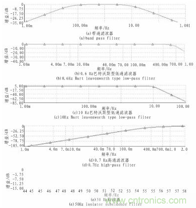 根據前麵的設計電路,對0.05~1O Hz帶通濾波器、10 Hz和0.6 Hz的低通濾波器、0.7 Hz的高通濾波器及50 Hz的陷波器電路中各元件進行估值並通過MulTIsim仿真且反複調試,並通過電路試驗,獲得了較為理想的幅頻特性,各部分電路的幅頻特性測試結果如圖 8所示。從圖8中可以看出,0.05~1O Hz帶通濾波器、10 Hz和0.6 Hz低通濾波器、0.7 Hz的高通濾波器都具有平坦的3 dB通頻帶,50 Hz陷波器的Q值大於5。