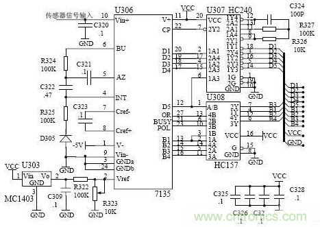 本電路由一個小型集成電路來實現,采樣後的信號經過電位器送到ICL7135 進行處理,將處理後信號直接送到單片機最小係統。ICL7135 量程為0~2V,基準電壓由MC1403 輸出(2.5V)分壓獲得1V 電壓。