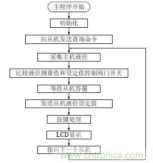 軟件部分主要是利用51 係列單片機作控製器,傳感器輸出電壓進行采樣,將采樣值與設定值比較,單片機對電磁閥控製來調節液位,主機通過485 通訊給分機設定數值,分機控製器對分機液位進行控製。軟件部分包括ICL7135 采樣部分、485 通訊部分、數字處理部分、顯示部分、鍵盤部分等。為了避免在傳感器移動造成測量數據不準確,特別增加了調零功能,進一步提高了係統的準確性。主程序流程圖如圖4 所示。