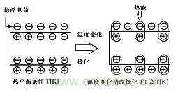 當(dang)一(yi)些(xie)晶(jing)體(ti)受(shou)熱(re)時(shi),在(zai)晶(jing)體(ti)兩(liang)端(duan)將(jiang)會(hui)產(chan)生(sheng)數(shu)量(liang)相(xiang)等(deng)而(er)符(fu)號(hao)相(xiang)反(fan)的(de)電(dian)荷(he),這(zhe)種(zhong)由(you)於(yu)熱(re)變(bian)化(hua)產(chan)生(sheng)的(de)電(dian)極(ji)化(hua)現(xian)象(xiang),被(bei)稱(cheng)為(wei)熱(re)釋(shi)電(dian)效(xiao)應(ying)。通(tong)常(chang),晶(jing)體(ti)自(zi)發(fa)極(ji)化(hua)所(suo)產(chan)生(sheng)的(de)束(shu)縛(fu)電(dian)荷(he)被(bei)來(lai)自(zi)空(kong)氣(qi)中(zhong)附(fu)著(zhe)在(zai)晶(jing)體(ti)表(biao)麵(mian)的(de)自(zi)由(you)電(dian)子(zi)所(suo)中(zhong)和(he),其(qi)自(zi)發(fa)極(ji)化(hua)電(dian)矩(ju)不(bu)能(neng)表(biao)現(xian)出(chu)來(lai)。當(dang)溫(wen)度(du)變(bian)化(hua)時(shi),晶(jing)體(ti)結(jie)構(gou)中(zhong)的(de)正(zheng)負(fu)電(dian)荷(he)重(zhong)心(xin)相(xiang)對(dui)移(yi)位(wei),自(zi)發(fa)極(ji)化(hua)發(fa)生(sheng)變(bian)化(hua),晶(jing)體(ti)表(biao)麵(mian)就(jiu)會(hui)產(chan)生(sheng)電(dian)荷(he)耗(hao)盡(jin),電(dian)荷(he)耗(hao)盡(jin)的(de)狀(zhuang)況(kuang)正(zheng)比(bi)於(yu)極(ji)化(hua)程(cheng)度(du),圖(tu)1表示了熱釋電效應形成的原理。