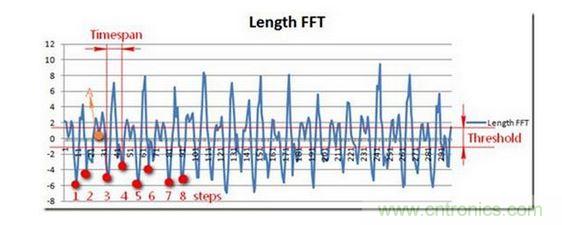 人體最快的跑步頻率為5HZ,也就是說相鄰兩步的時間間隔的至少大於0.2秒,如圖所示,我們設置了timespan在記步過程中我們過濾了高頻噪聲,即步頻過快的情況。同時我們通過和上次加速度大小進行比較,設置設立一定的閥值Threshold來判斷運動是否屬於有效,有效運動才可進行記步。