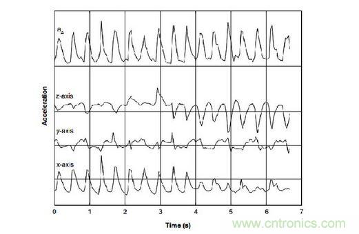 反fan映ying到dao圖tu表biao中zhong,可ke以yi看kan到dao,在zai步bu行xing運yun動dong中zhong,垂chui直zhi和he前qian進jin產chan生sheng的de加jia速su度du與yu時shi間jian大da致zhi為wei一yi個ge正zheng弦xian曲qu線xian,而er且qie在zai某mou點dian有you一yi個ge峰feng值zhi。其qi中zhong,垂chui直zhi方fang向xiang的de加jia速su度du變bian化hua最zui大da,通tong過guo對dui軌gui跡ji的de峰feng值zhi進jin行xing檢jian測ce計ji算suan和he加jia速su度du閥fa值zhi決jue策ce,即ji可ke實shi時shi計ji算suan用yong戶hu運yun動dong的de步bu數shu,還hai可ke依yi此ci進jin一yi步bu估gu算suan用yong戶hu步bu行xing距ju離li。