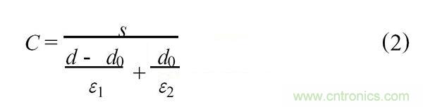 式中,S為極板相互遮蓋麵積,單位為m2;d為兩平行板間的距離,單位為m;ε為極板間介質的介電常數;εr極板間介質的相對介電常數;ε0真空的介電常數。從上式可以看出,當d小時可使電容量增大,而使靈敏度增加,但d過小容易引起電容器擊穿,一般我們可以采取在極板間放置雲母來改善,此時電容C為兩電容串聯,可寫成: