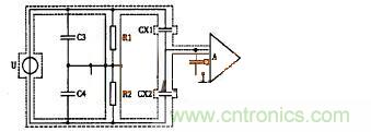 第(di)三(san)個(ge)問(wen)題(ti)是(shi)分(fen)布(bu)電(dian)容(rong)的(de)影(ying)響(xiang)。由(you)於(yu)電(dian)容(rong)傳(chuan)感(gan)器(qi)一(yi)個(ge)很(hen)關(guan)鍵(jian)的(de)問(wen)題(ti)是(shi)分(fen)布(bu)電(dian)容(rong)電(dian)容(rong)量(liang)與(yu)傳(chuan)感(gan)器(qi)電(dian)容(rong)量(liang)相(xiang)比(bi)不(bu)僅(jin)不(bu)能(neng)忽(hu)略(lve),而(er)且(qie)影(ying)響(xiang)還(hai)極(ji)其(qi)嚴(yan)重(zhong),其(qi)後(hou)果(guo)是(shi)造(zao)成(cheng)傳(chuan)輸(shu)效(xiao)率(lv)降(jiang)低(di)、靈敏度下降、測量誤差增加及穩定性變差。近幾年來,對此問題有了新的解決途徑。其中“整體屏蔽法”就是一例,以差動電容傳感器為例,說明整體屏蔽法,在下圖中,CX1、CX2為差動電容,U為電源,A為放大器,整體屏蔽法是把整個電橋(包含電源電纜等)一起屏蔽起來,設計的關鍵點在於接地點的合理設置。采用把接地點放在兩個平衡電阻R1、R2之間與整體屏蔽共地,這樣,傳感器公用極板與屏蔽之間的分布電容C1與放大器的輸入阻抗並聯,從而可把C1視作放大器的輸入電容。由於放大器的輸入阻抗有極大值,C1的並聯也不希望存在,但它隻影響靈敏度而已,另外兩個分布電容C3、C4並聯在橋臂R1、R2上(shang),會(hui)影(ying)響(xiang)電(dian)橋(qiao)的(de)初(chu)始(shi)平(ping)衡(heng)和(he)整(zheng)體(ti)靈(ling)敏(min)度(du),並(bing)不(bu)影(ying)響(xiang)電(dian)橋(qiao)的(de)正(zheng)常(chang)工(gong)作(zuo)。因(yin)此(ci),分(fen)布(bu)參(can)數(shu)對(dui)傳(chuan)感(gan)器(qi)電(dian)容(rong)的(de)影(ying)響(xiang)基(ji)本(ben)消(xiao)除(chu),整(zheng)體(ti)屏(ping)蔽(bi)法(fa)是(shi)解(jie)決(jue)電(dian)容(rong)傳(chuan)感(gan)器(qi)分(fen)布(bu)電(dian)容(rong)問(wen)題(ti)的(de)很(hen)好(hao)方(fang)法(fa),缺(que)點(dian)是(shi)使(shi)結(jie)構(gou)複(fu)雜(za)。