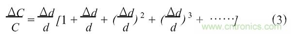 最後要說明的是關於非線性的問題。由下圖我們可以看到變間隙式電容傳感器相對輸出表達式為: