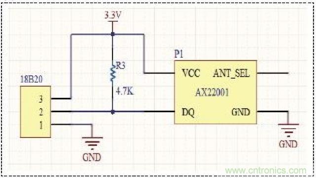 溫度采集單元主要有傳感器、處理器和電源組成,傳感器18B20負責區域內溫度信息的采集和數據轉換,將溫度的傳感器信息經過A/D轉換,得到數字信息,供處理器AX22001進行處理。其原理圖如圖1所示,其中ANT_SEL引腳接天線,用來傳送無線信號。