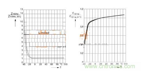 在(zai)鋁(lv)電(dian)解(jie)高(gao)壓(ya)電(dian)容(rong)器(qi)的(de)正(zheng)常(chang)運(yun)行(xing)過(guo)程(cheng)中(zhong),其(qi)本(ben)身(shen)的(de)電(dian)解(jie)液(ye)導(dao)電(dian)性(xing),將(jiang)會(hui)隨(sui)著(zhe)環(huan)境(jing)溫(wen)度(du)的(de)降(jiang)低(di)而(er)降(jiang)低(di),從(cong)而(er)會(hui)導(dao)致(zhi)電(dian)解(jie)液(ye)阻(zu)抗(kang)的(de)增(zeng)加(jia),阻(zu)抗(kang)和(he)損(sun)耗(hao)角(jiao)正(zheng)切(qie)也(ye)會(hui)因(yin)此(ci)而(er)增(zeng)大(da)。在(zai)絕(jue)大(da)多(duo)數(shu)應(ying)用(yong)中(zhong),相(xiang)應(ying)增(zeng)加(jia)僅(jin)允(yun)許(xu)到(dao)某(mou)最(zui)大(da)值(zhi)。在(zai)這(zhe)裏(li)需(xu)要(yao)強(qiang)調(tiao)的(de)一(yi)點(dian)是(shi),低(di)於(yu)上(shang)述(shu)溫(wen)度(du)限(xian)值(zhi)的(de)工(gong)作(zuo)並(bing)不(bu)會(hui)損(sun)壞(huai)高(gao)壓(ya)電(dian)容(rong),僅(jin)僅(jin)隻(zhi)是(shi)會(hui)影(ying)響(xiang)其(qi)使(shi)用(yong)壽(shou)命(ming),尤(you)其(qi)是(shi)當(dang)紋(wen)波(bo)電(dian)流(liu)流(liu)經(jing)器(qi)件(jian)時(shi),由(you)於(yu)增(zeng)加(jia)ESR而產生的熱量耗散會提高電容器溫度,使其遠大於環境溫度,使電容可維持設備運行。下圖所示為下限類別溫度為-25℃電容器的阻抗和電容典型值。