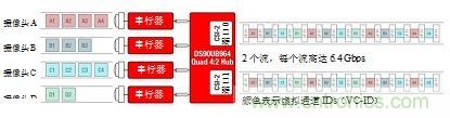 圖3所示為四攝像頭係統,具有由彩色塊所示的不同數據速率。聚合數據在移動工業處理器接口(MIPI)攝像頭串行接口(CSI)-2端口0和1兩者處呈現。CSI-2總線具有“突發性”,意味著其以固定數據速率運行、將發送數據為可用狀態,並且當機器空閑時恢複到低功率(LP)狀態。因此,傳感器速度可在不改變ECU處理器時序的條件下進行變化。即使傳感器鏈路以獨立頻率運行,解串器集線器在單個參考時鍾上也可將數據提供給片上係統(SoC)處理器,從而簡化係統時序。