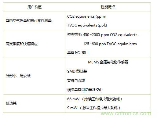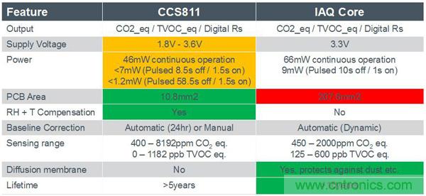 和CCS801相比,CCS811繼承了其很多優點,如:出色的感測範圍與精度、支持長達5年壽命的特殊工藝等等。而兩者最大的差異在於,CCS811是一個數字VOC傳感器,其內部集成了一個MCU,可以直接對傳感器的驅動和測量進行管理,並通過一個I2C接口與外部進行數據通信。雖然集成了更多的功能,CCS811仍然保持了相當“纖細”的身材,采用2.7 x 4.0mm的LGA封裝,使得PCB占板麵積可以節省60%,節省了BOMchengben。tongshi,youyuneibuhaijichenglexiangyingdesuanfa,shidezhongduanchanpindekaifayedeyijianhua,jinyibujiangdilezhengtidechengben。xiangbixiaofeileiyonghukandaoxiamianzhegeCCS811的性能清單,會非常動心。