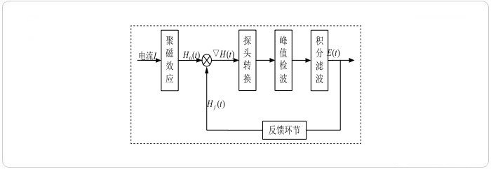 電dian流liu傳chuan感gan器qi的de係xi統tong框kuang圖tu所suo示shi。電dian流liu所suo產chan生sheng的de的de磁ci場chang在zai磁ci通tong門men探tan頭tou內nei經jing激ji勵li信xin號hao調tiao製zhi後hou,通tong過guo峰feng值zhi檢jian波bo和he積ji分fen濾lv波bo電dian路lu產chan生sheng有you用yong的de電dian壓ya信xin號hao,然ran後hou經jing過guo反fan饋kui,使shi電dian流liu傳chuan感gan器qi工gong作zuo在zai零ling磁ci通tong狀zhuang態tai。