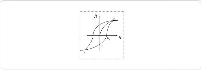 一般磁性材料都有S形狀曲線的特性,稱之為磁滯回路(hysteresis loop),如圖2所示。此磁滯回路曲線建立在B—H的坐標軸上,為磁性材料遭受完全磁化與非磁化周期,圖示為典型磁滯曲線的鐵心,如果曲線由a點開始,此點表示最大正磁化力,至b點磁化力為零,然後下降至c點為最大負磁化力,再至d點磁化力為零,最後返回最大正磁化力的a點,此即為整個磁性周期。高導磁率、低矯頑力磁芯的磁滯回線如圖3所示。