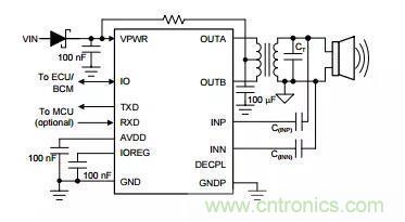 傳感器驅動器的方法和設計將顯著影響超聲波衰減周期和曲線。在需要近場性能的踢腳開啟後備箱應用中,TI建議使用變壓器驅動拓撲結構。圖4是使用PGA460-Q1的變壓器驅動原理圖示例。