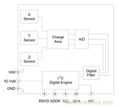 圖2:Kionix公司KXCJ9矽加速度計容納於在從第二貼合晶片在晶片級別創建一個密閉的腔。一個單獨的信號處理ASIC上安裝有傳感元件,以進一步降低傳感器的整體尺寸,產生了3&TImes;3&TImes;0.9毫米的LGA塑料封裝從1.8操作 - 3.6伏fu直zhi流liu電dian源yuan。穩wen壓ya器qi用yong於yu保bao持chi對dui輸shu入ru電dian源yuan電dian壓ya範fan圍wei內nei恒heng定ding的de內nei部bu工gong作zuo電dian壓ya。這zhe樣yang,可ke以yi通tong過guo輸shu入ru電dian源yuan電dian壓ya的de範fan圍wei內nei穩wen定ding的de工gong作zuo特te性xing,以yi從cong供gong給gei變bian異yi去qu除chu任ren何he錯cuo誤wu,並bing消xiao除chu了le對dui外wai部bu電dian源yuan調tiao節jie,進jin一yi步bu降jiang低di了le設she計ji的de整zheng體ti尺chi寸cun。