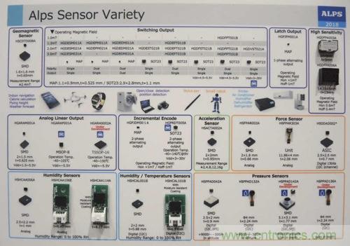 日本阿爾卑斯電氣株式會社(Alps Electric)展示其傳感器組合(下圖),這同時也可作為傳感器領域應用多樣化的一個指標。該公司並未在活動中發表新芯片,而是與網關供貨商、美國雲端運算軟件供貨商Mode連手展示使用其模塊開發的端對端物聯網解決方案。