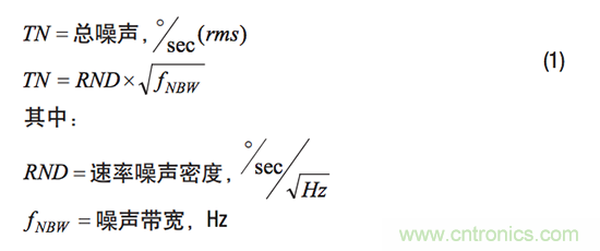 傳感器固有噪聲代表的是陀螺儀在靜態慣性和環境條件下運行時其輸出中的隨機振動。MEMS IMU數據手冊通常會提供速率噪聲密度(RND)參數來描述陀螺儀相對於頻率的固有噪聲。此參數通常使用單位°/s/√Hz,是預測特定濾波器配置固有噪聲的關鍵。公式1給出了一種簡單方法來估算與特定頻率響應(噪聲帶寬)和RND相關的噪聲。