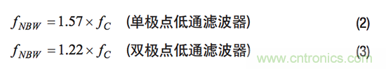 當RND的頻率響應遵循單極點或雙極點低通濾波器曲線時,噪聲帶寬(fNBW)和濾波器截止頻率(fC)將有公式2和公式3的關係。