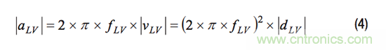 由於陀螺儀用於測量旋轉角速率,因此其對線性運動的響應會引入測量誤差。MEMS IMU數據手冊通常通過“線性加速度對偏置的影響”或“線性加速度”等參數來描述對線性運動的這一響應,這些參數通常使用單位°/s/g。線性振動是一種重複的慣性運動,其幅度大小可通過位移(m)、線性速度(m/s)或線性加速度(m/s2或g)表示。在特定的振動頻率(fLV)下,位移(|dLV|)、速度(|vLV|)和加速度(|aLV|)之間的幅度關係如公式4所示。
