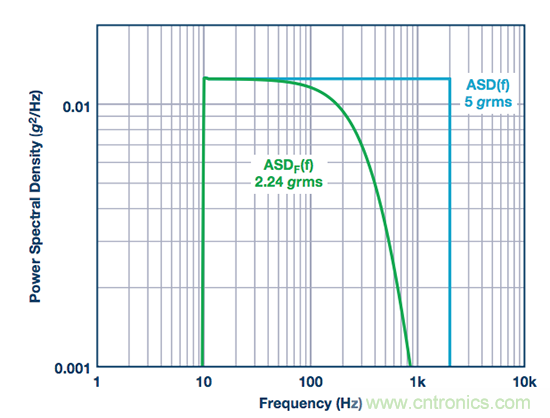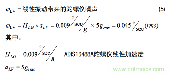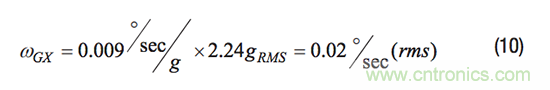 公式10通過線性加速度參數乘以ASDF (f)曲線幅值2.24 g rms,可估算產生的噪聲電平為0.02°/s (rms)。此噪聲電平比通過公式5得到的0.045°/s (rms)低55%,公式5的方法未采用頻譜項評估此噪聲源。這種改善是采用頻譜項定義振動曲線以獲取值的一個示例。