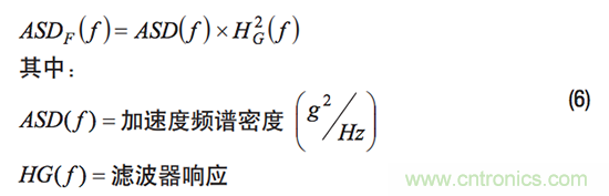 如圖1所示,陀螺儀信號鏈常常包括濾波器,這有助於減少線性振動引起的噪聲。以頻譜項(幅度、頻率)定義振動可在估算噪聲貢獻時考慮濾波器的影響。加速度頻譜密度(ASD)函數是以頻譜項表達振動的常見方式,通常使用單位g2/Hz。下麵通過示例說明已知ASD和陀螺儀頻率響應(HG)時估算噪聲幅度的步驟: