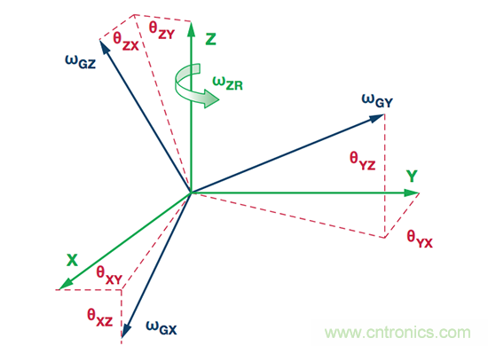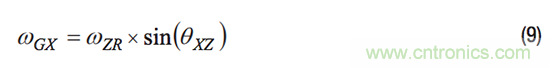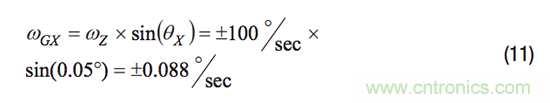 每個陀螺儀的對齊誤差均具有兩個分量,分別定義其相對於慣性參考係中另一個軸的對齊誤差。例如,對於圖2中的係統,θXZ代表x軸陀螺儀相對於z軸的對齊誤差。此對齊誤差定義有助於建立公式以計算離軸陀螺儀對係統慣性參考係中圍繞另一個軸旋轉運動的響應。公式9中給出了一個示例,其量化了x軸陀螺儀相對於z軸的對齊誤差(θXZ)和圍繞z軸旋轉(ωZR)而產生的響應(ωGX)。