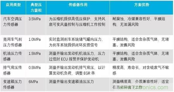汽車領域陶瓷電容壓力傳感器典型應用如下表所示: