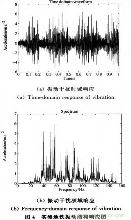從圖(4)看出,地鐵振動噪聲頻率主要集中在20---160Hz,其他頻段的分量很小。地鐵振動在隧道結構上產生的噪聲幅值一般是0.029左右。由於SCAl00T分辨率非常高,可以識別出40ugzuoyoudeweijiasuduxinhao,zaiqingjiaoceliangguochengzhonghenrongyishoudaoditiezhendongzaoshengdeganrao。yincixuyaogeikongzhiqixuanzeheshideshuzilvbosuanfa,xiaochuditiezhendongzaoshengduichuanganqijingdudeyingxiang。