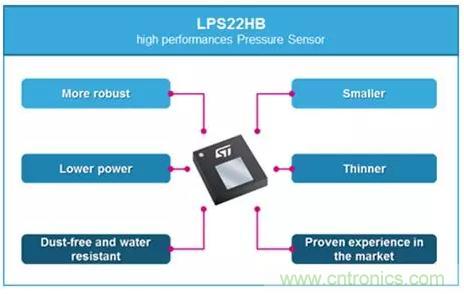 氣壓傳感器:LPS22HBTR,測量範圍:260 to 1260 mbar,ODR 支持1Hz 到75Hz,功耗:4uA,可以用於海拔信息測量。