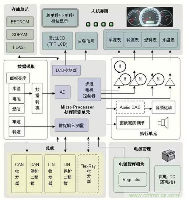 在汽車儀表係統中,各種儀表的傳感器的作用是將發動機溫度、機油壓力、發動機轉速、變速器輸出軸轉速、燃油箱油麵的高低等物理參量轉換為相應的電壓、電流或電脈衝。並驅動相應的儀表動作,顯示相應的被測量參量。當測量值達到預設的極限值時就會使指示燈報警。