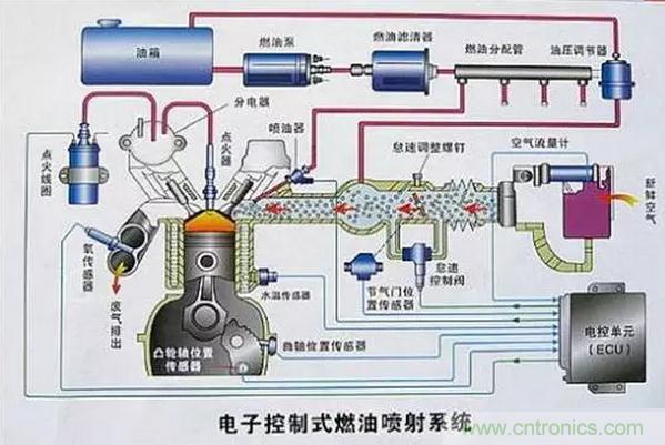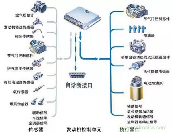 汽車電子控製係統有傳感器、電子控製器(ECU)和he執zhi行xing器qi的de組zu成cheng。在zai汽qi車che電dian子zi控kong製zhi係xi統tong中zhong,傳chuan感gan器qi的de作zuo用yong是shi將jiang被bei控kong對dui象xiang的de相xiang關guan參can量liang轉zhuan換huan為wei相xiang應ying的de電dian信xin號hao,並bing輸shu送song給gei控kong製zhi器qi,控kong製zhi器qi根gen據ju相xiang關guan傳chuan感gan器qi的de信xin號hao對dui被bei控kong對dui象xiang的de工gong況kuang及ji狀zhuang態tai進jin行xing分fen析xi與yu判pan斷duan後hou,輸shu出chu控kong製zhi信xin號hao,通tong過guo執zhi行xing器qi實shi現xian自zi動dong控kong製zhi。電dian子zi控kong製zhi係xi統tong分fen為wei發fa動dong機ji電dian子zi控kong製zhi係xi統tong、底盤電子控製係統和車身電子控製係統。