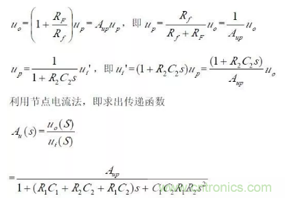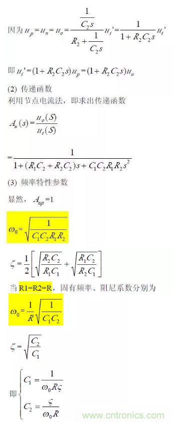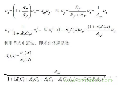 對於二階壓控低通濾波器來說,當通帶放大倍數Aup =1(單位增益)時,圖所示電路變為圖所示,其中RF=R1+R2。