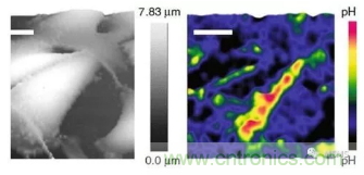 團隊成員在活的癌細胞上進行測試,並展示了該裝置如何從缺乏雌激素的乳腺癌細胞浸潤性表型中檢測到細胞外pH值的增加。他們還可以檢測光合作用中,由於無機碳的吸收所導致的暴露於陽光下藻類的pH值變化,並且可以從高分辨率pH值圖中識別出侵襲性黑色素瘤細胞的異質性。