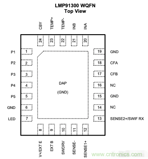 LMP91300采用4mm x 5mm 24端子WQFN和2.05mm x 2.67mm 20端子DSBGA封裝,工作溫度範圍為–40°C至+ 125°C。